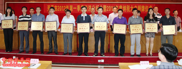 2012年5月7日下午,我司梁國宏同志代表出席了在開平市2012第一季度經(jīng)濟分析會暨2011年度納稅大戶授牌儀式。會上公布了開平市2011年度納稅大戶的獲獎名單,其中我集團公司等35家納稅超千萬企業(yè)分別被授予了“開平市2011年度納稅大戶”的光榮稱號,市領(lǐng)導文彥、梁和平、陳偉成等領(lǐng)導均出席會議并向納稅大戶授牌。會議希望被授予稱號的企業(yè),在以后能以發(fā)展為先,以創(chuàng)新為要,爭當拉動我市經(jīng)濟發(fā)展的“火車頭