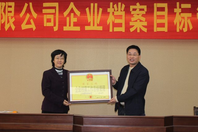 2010年12月24日上午“廣東金輝華集團有限公司企業(yè)檔案目標(biāo)管理國家二級認(rèn)定會”在集團技術(shù)中心會議室舉行,我司最終以88.2分的高分通過了企業(yè)檔案目標(biāo)管理國家二級認(rèn)定。圖為:我司接受企業(yè)檔案工作目標(biāo)管理二級牌匾與會人員有江門市檔案局副局長...
