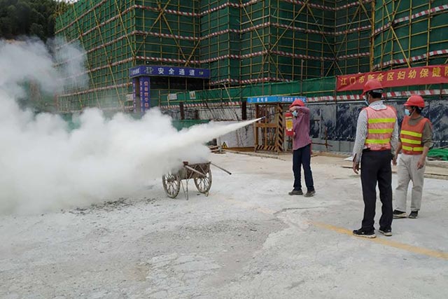 2、消防演練:江門市新會區(qū)婦幼保健院新院工程消防演練,此次消防演練主要針對建筑工地人員集中、易燃材料多、用電負荷大、作業(yè)人員消防意識差、消防技能弱等特點進行培訓、宣教,目的使現(xiàn)場作業(yè)人員增強消防安全意識、掌握消防常識、了解操作流程,具備檢查消除火災隱患能力、組織撲救初期火災能力及在火勢控制不住的情況下如何逃生、避免人員傷亡的能力。圍繞火災隱患檢查預防的方法、火災發(fā)生的原因、用火安全事故的防范、發(fā)生火災時應采取何種應急措施等內(nèi)容進行消防知識講解,闡述了防火、滅火的技巧和方法,講述滅火器、消火栓的使用方法及救火要點。并在工地內(nèi)選擇一處假設著火點,在場人員通過專業(yè)的講解、觀看正確操作方法及逐一實際操作,掌握了消防知識及滅火器的正確使用方法,提高了現(xiàn)場作業(yè)人員防火救火、自防自救能力。
